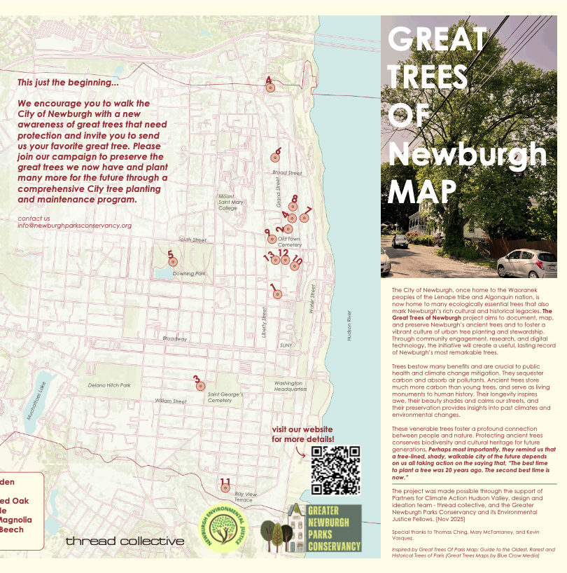 Great Trees of Newburgh Map created in partnership with thread collective; creative content from GNPC's 2025 Environmental Justice Fellows; historical research from Mary McTamaney; and tree expertise from Kevin Vasquez and Thomas Ching. Inspired by the Great Trees of Paris Map and supported in part by initial seed funding from Partners for Climate Action Hudson Valley.
